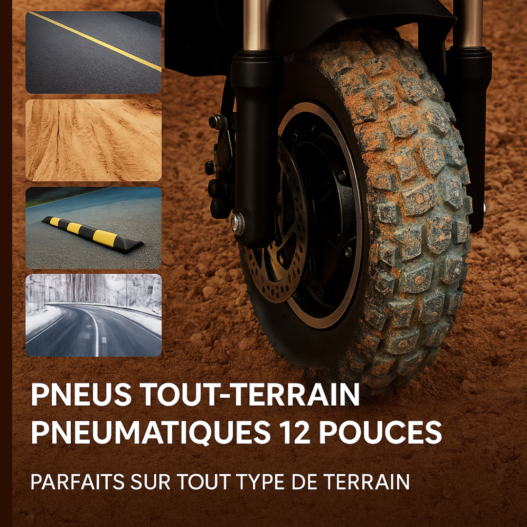 Roues tout-terrain 12 pouces : pneus à forte adhérence garantissant sécurité et confort sur routes accidentées.